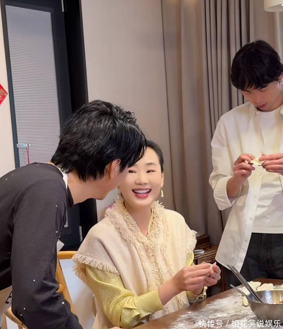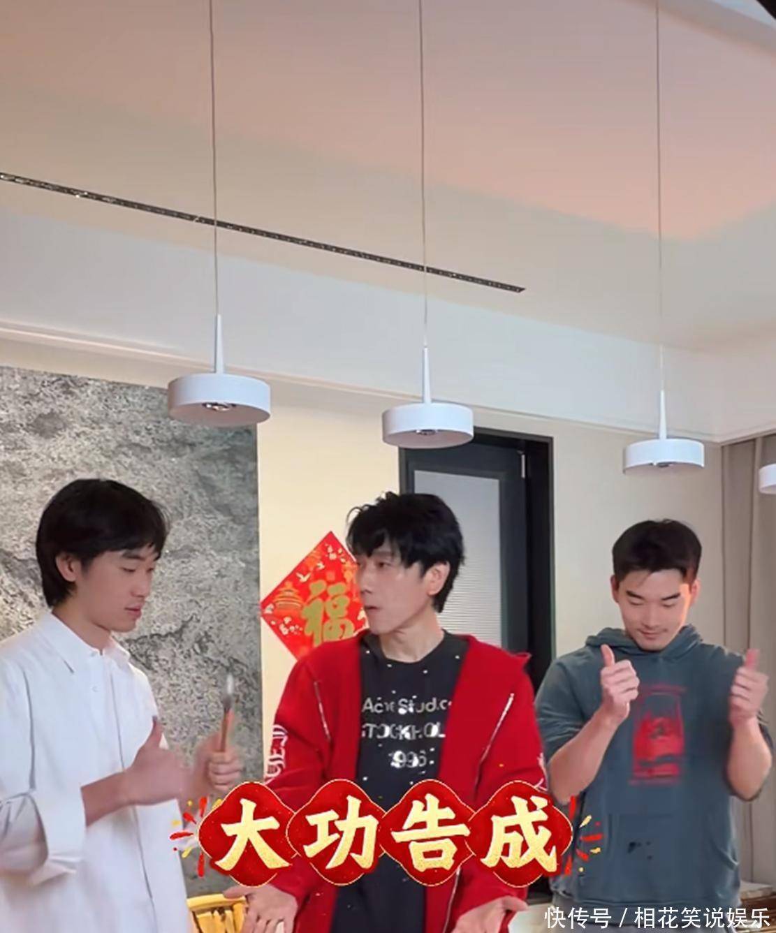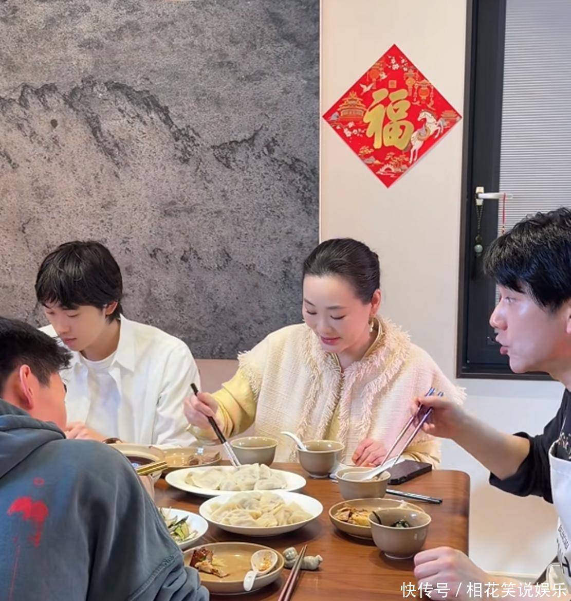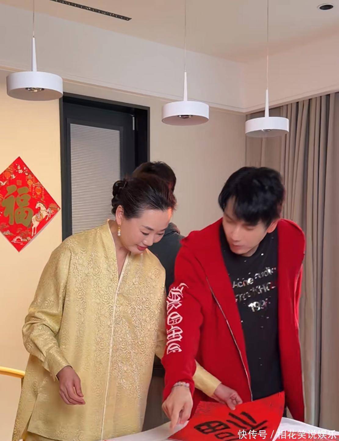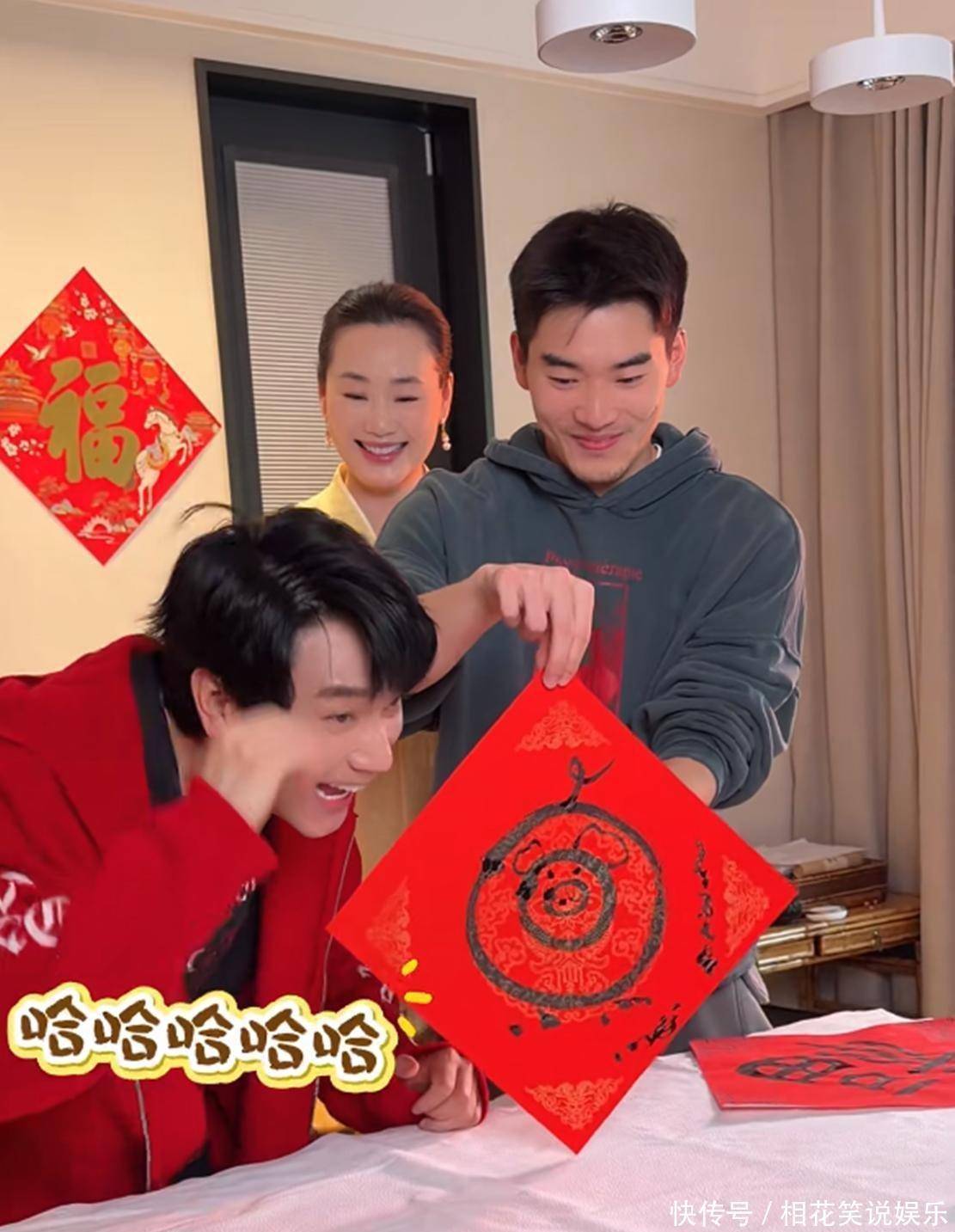 接着林依轮也出现在画面里了,他比妻子还年长一岁呢,可看上去特别显年轻。瞧他那头黑色短发,干净又利落,上身穿着黑色内搭,外面套了件喜庆的红色外套,跟两个儿子站一块儿,就像他们的同龄伙伴似的。林依轮性格特别活泼,在家里那可是活跃气氛的一把好手。就说写福字这事儿吧,他写完之后,就像个盼表扬的小孩儿,眼巴巴看着俩儿子等夸赞。俩儿子也给力,立马竖起大拇指,那模样比爸爸沉稳多了。这下可好,网友都调侃,说他们这一家四口,就像一个妈妈领着三个娃。