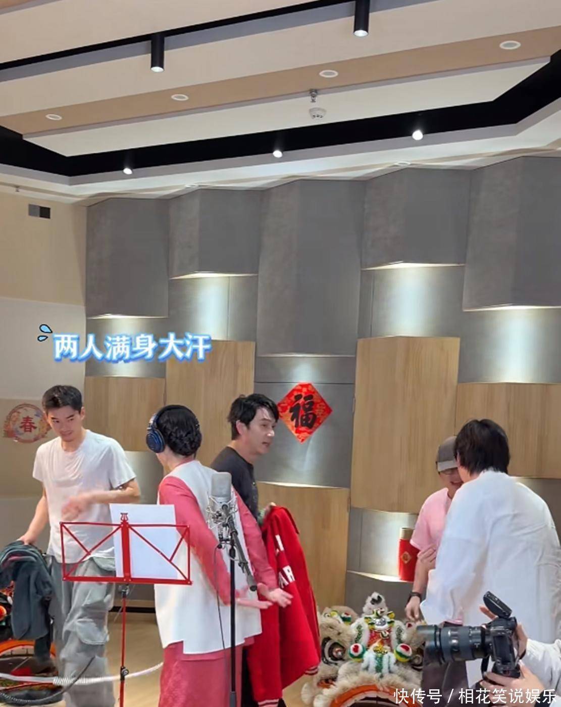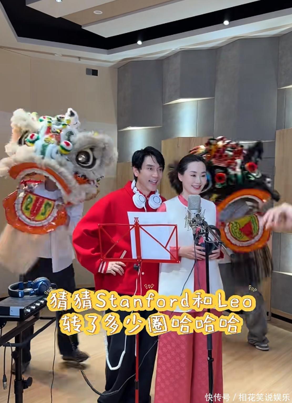 林依轮一家贴完春联、吃完饺子后,就着手录制新年歌曲啦。林依轮和老婆西华在前面放声歌唱,两个儿子在后面舞着狮子当陪衬,这一家四口聚在一起,那氛围别提多温馨欢乐了。