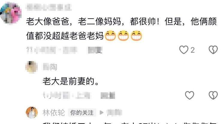 林依轮夫妇大大方方地让两个儿子亮相,有网友评论说,大儿子跟爸爸长得像,二儿子随了妈妈,都挺俊的,不过颜值上还是比不过他们爸妈。有网友在这条评论里说,林依轮的大儿子不是他和西华的孩子,而是跟前妻生的。没想到林依轮还特意回复了,他说:“咱俩都结婚三十一年了,老大都27岁了,你这不是要气死我吗!”这么看来,大儿子确实是他和西华亲生的。